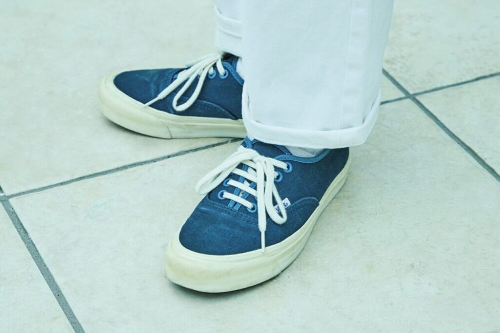 「スニーカーはヴァンズしか履きません。パンツはプレッピーを意識していて、ホワイトデニムをロールアップして穿くのがキモです」