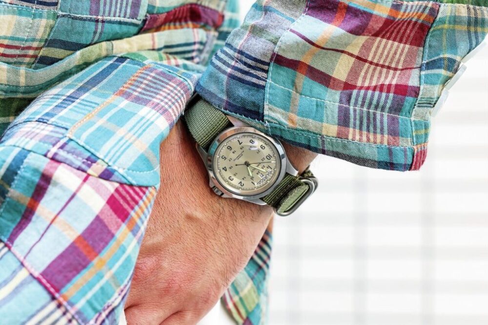 アイビーファッション歴10年以上の宮原さん、マドラスジャケットにミリタリーウォッチの合わせ、レザーやメタルではなく涼しげなベルトをチョイスしている。