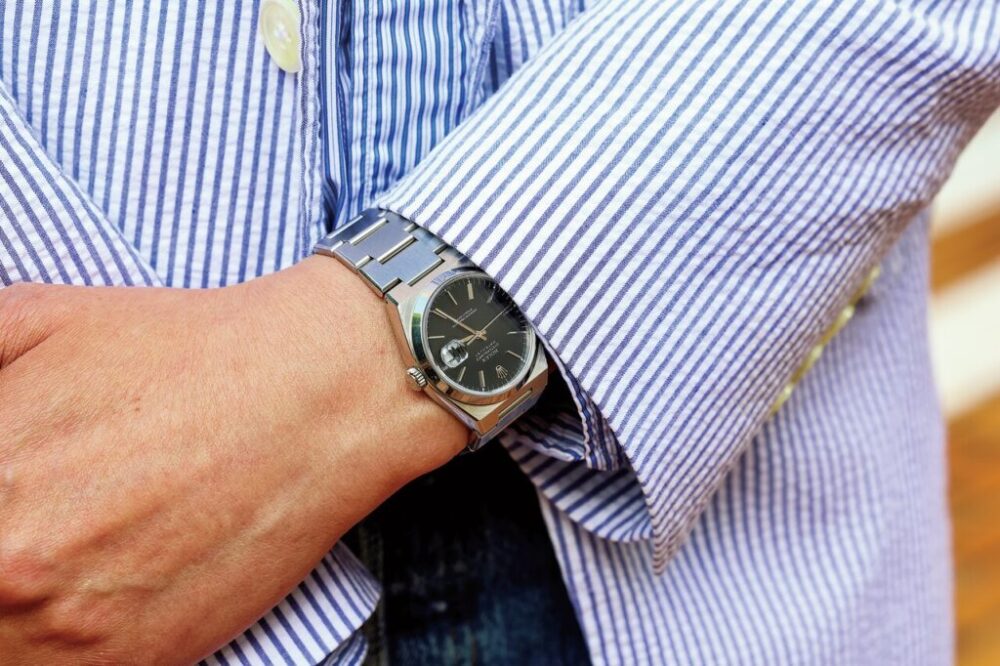 シアサッカーのような定番ジャケットと合わせると、時計の個性はより際立つ。小ぶりなため、あくまで上品ではあるが、角ばったブレスは他とは違う印象を与える。