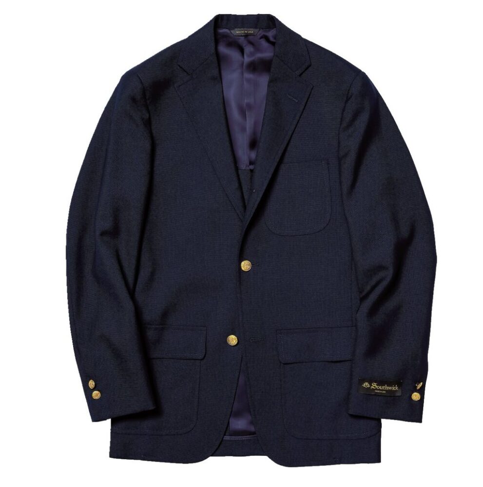 サウスウィックの代名詞でもある3つボタンのネイビーブレザー。「ナチュラルショルダー、段返り3つボタンなど伝統的な意匠が盛り込まれたブレザーです。現在もアメリカで生産されているのもポイントです」
