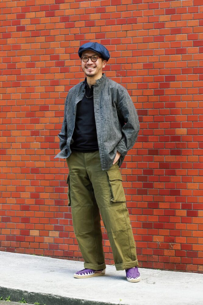 「まず前提として、全身長年愛用しているベーシックなアイテムでまとめた夏仕様のスタイルです。全体だけ見ると、キャスケットやポロシャツ、M-47など、フレンチの印象が強いですが、実はポロシャツはノリコイケというかつて存在したジャパンブランドの質実剛健な一着を取り入れた、自分だけに分かるハズしを入れています。