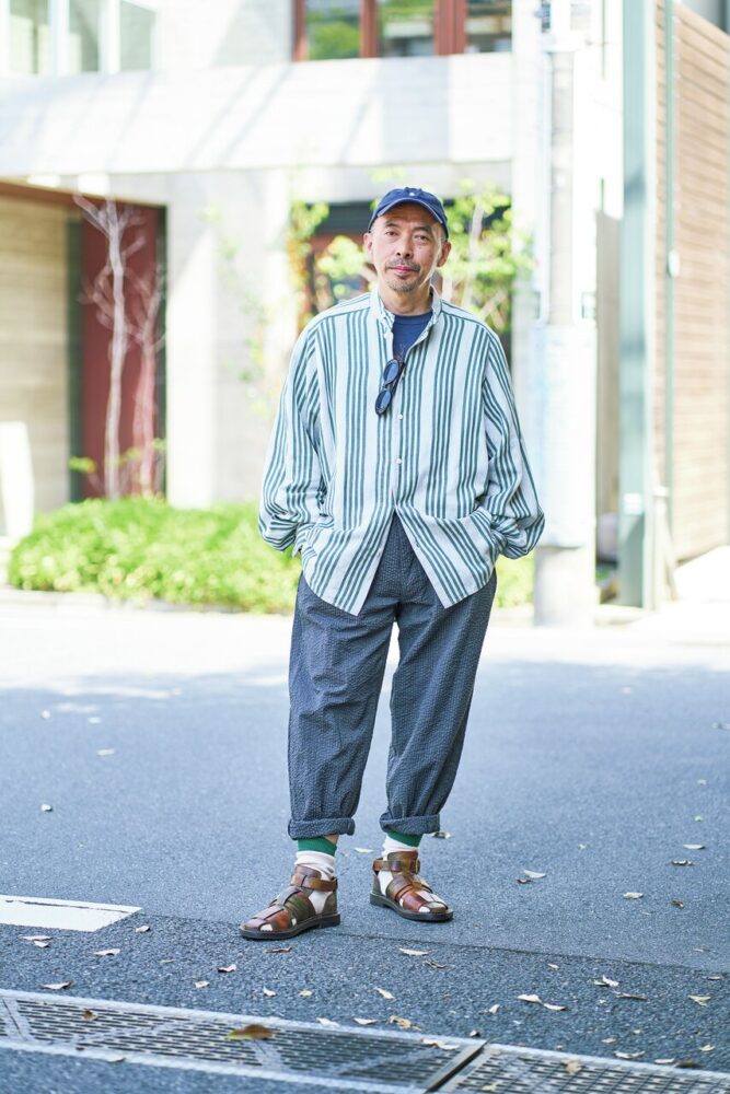 「今回のコーディネイトの主軸にあるのはフレンチアイビーです。フレンチヴィンテージから起こしたストライプ柄が特徴的なシャツに黒と白の撚り杢のシアサッカーパンツなど、フレンチな要素の詰まったアイテムがやはり好きですね。