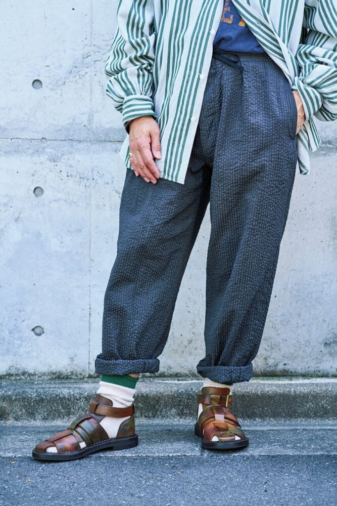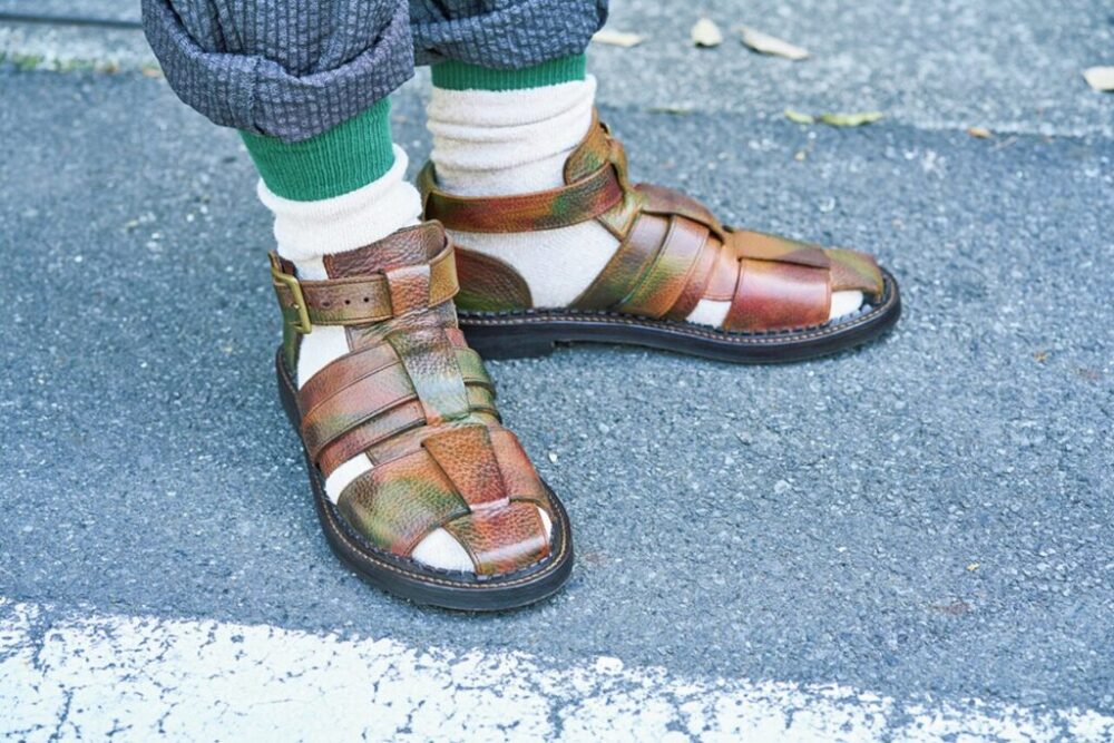 「フレンチグルカと呼ばれるレザーサンダルに、イギリスの迷彩柄をハンドペイントしたものです。謎の多い迷彩柄が気に入っています」