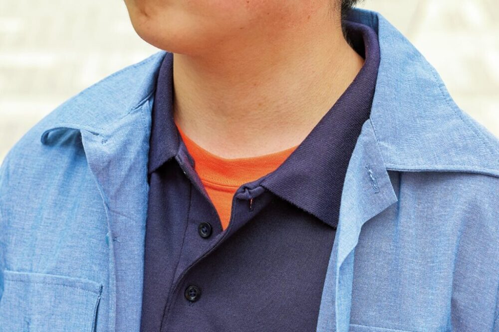 「ポロシャツから覗くオレンジのTシャツもポイントですね。アイテムの減る夏こそ奥行きを持たせたスタイリングにしたいですね」