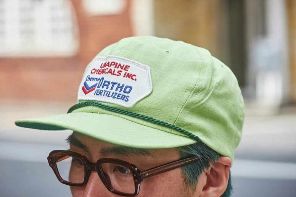 「夏らしく、キャップはリネンのものを選びました。メインアイテムの色とははずして黄緑のものを、謎企業ロゴも良いんです」