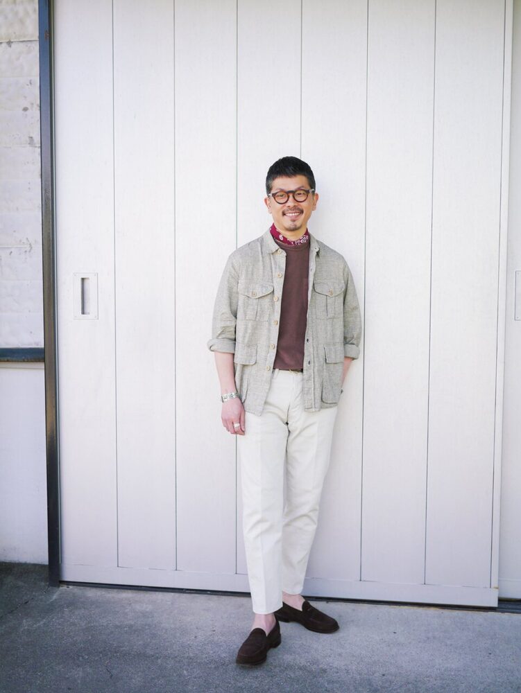【着こなし①】色味を抑え、素材で楽しむ大人な夏のスタイル。|マネージャー・鈴木誠治さん