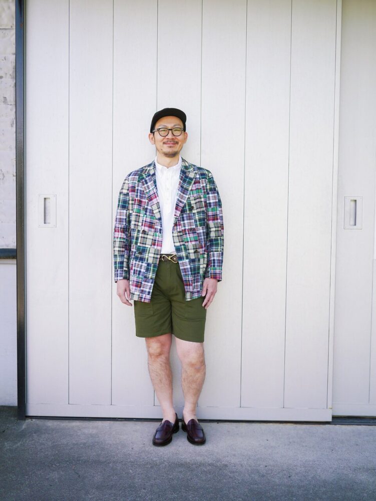本場インドにて織られたマドラスを使用したパッチワークジャケット。「派手なアイテムは、他のアイテムを調整して合わせることが大切。カジュアルに着こなしたかったのでパンツはブッシュショーツを合わせました」