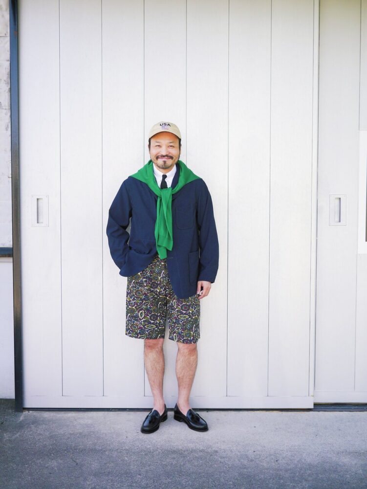 素材、縫製ともにイタリアにこだわったリネンジャケット。「リネンのジャケットにピケのパンツ、パイルのTシャツなど素材で夏を楽しむ着こなしにを注意しました。首元にはバンダナを巻き、差し色に赤を加えました」