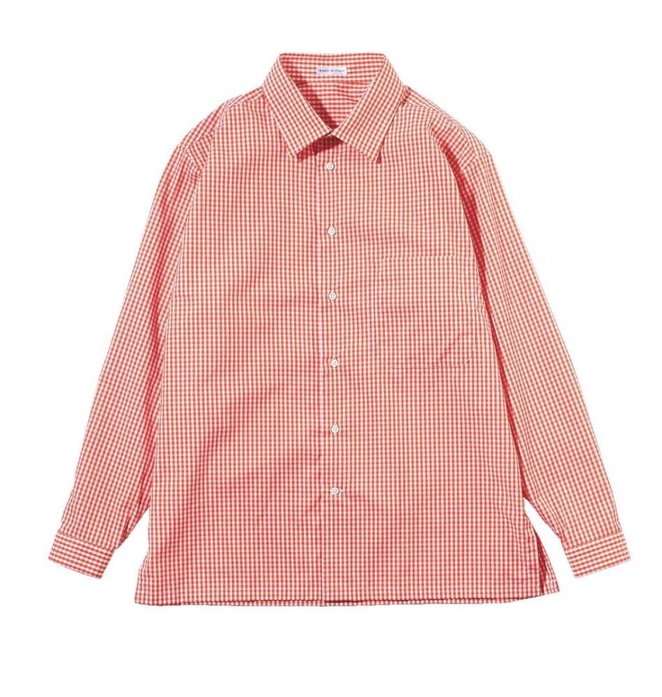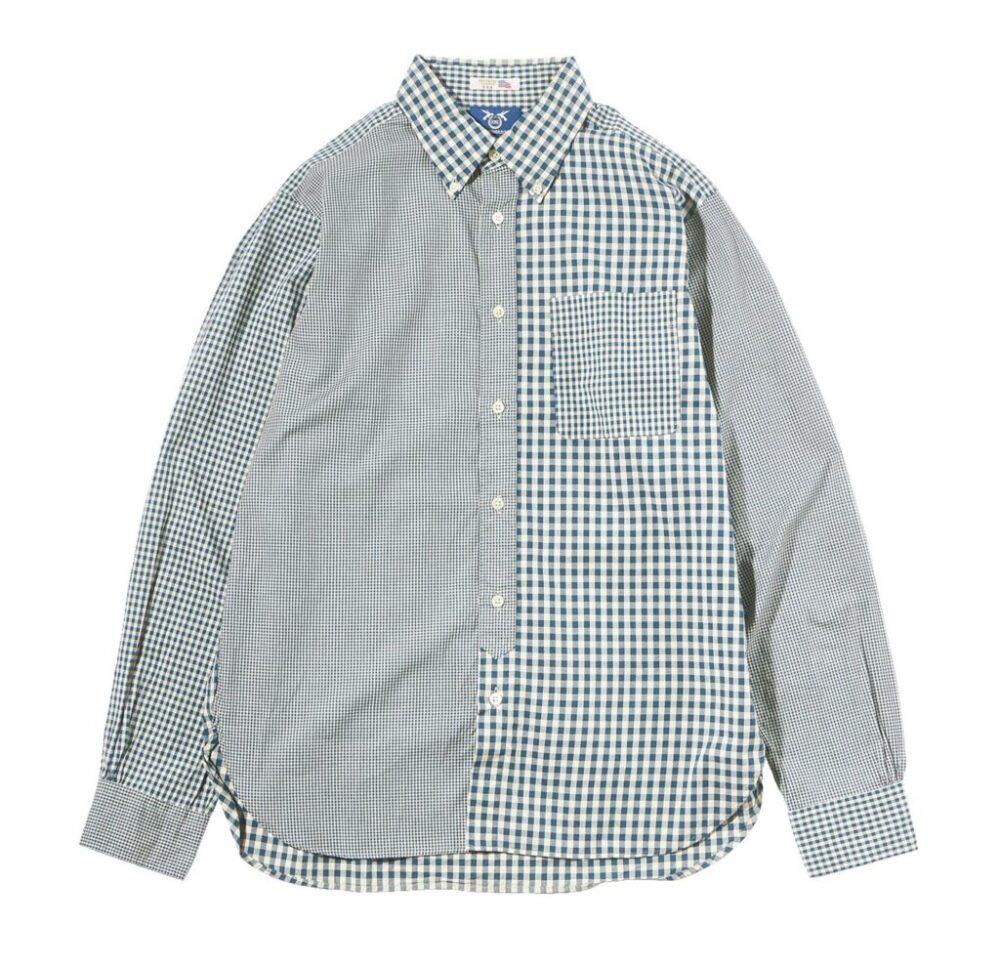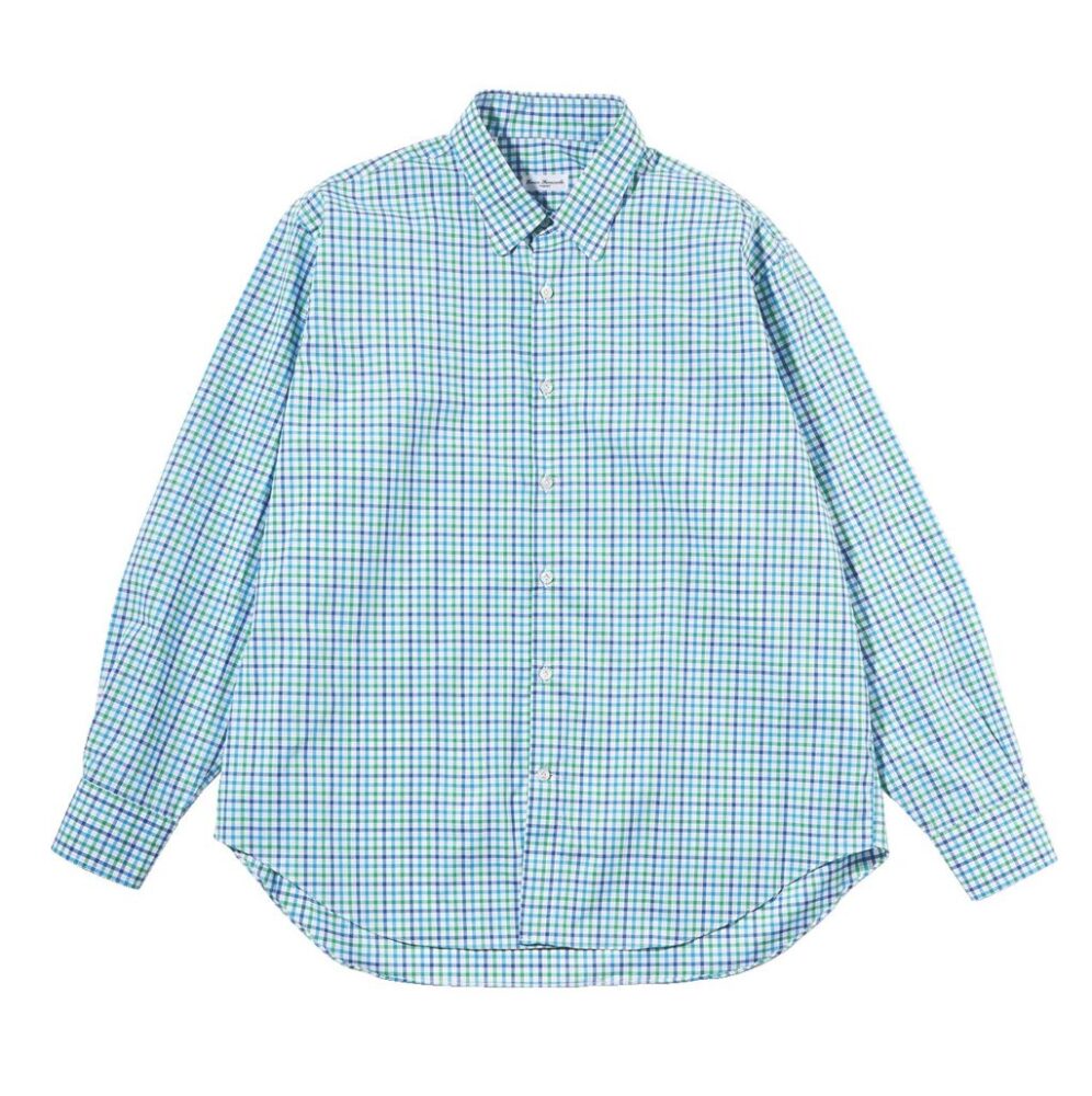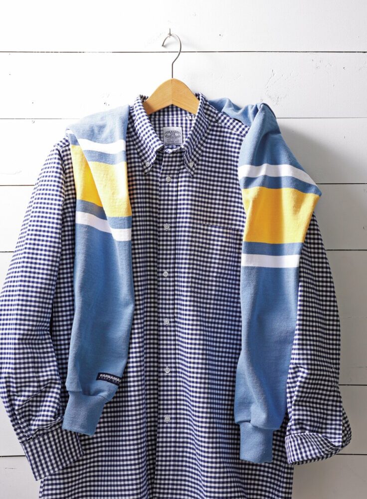 ギンガムチェックと言えばブルー、しかし生地はコットンオックスフォードというやや変化球が面白い。脇縫いはタフな本巻き縫いで非常に手の込んだ本格仕様のクラシックフィット。BDシャツ1万780円/バギー(メイン TEL03-3264-3738)