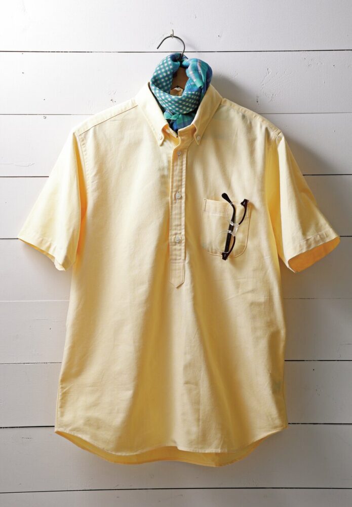 数種類のオックス生地を有する同ブランドのなかでは中厚で通年でも楽しめるケンブリッジオックスフォードを使用。休日のアメリカントラッドスタイルには欠かせない美しいレモンイエローカラーが爽快感を助長させる。BDシャツ3万1500円(ユーソニアングッズストアTEL03-5410-1776)