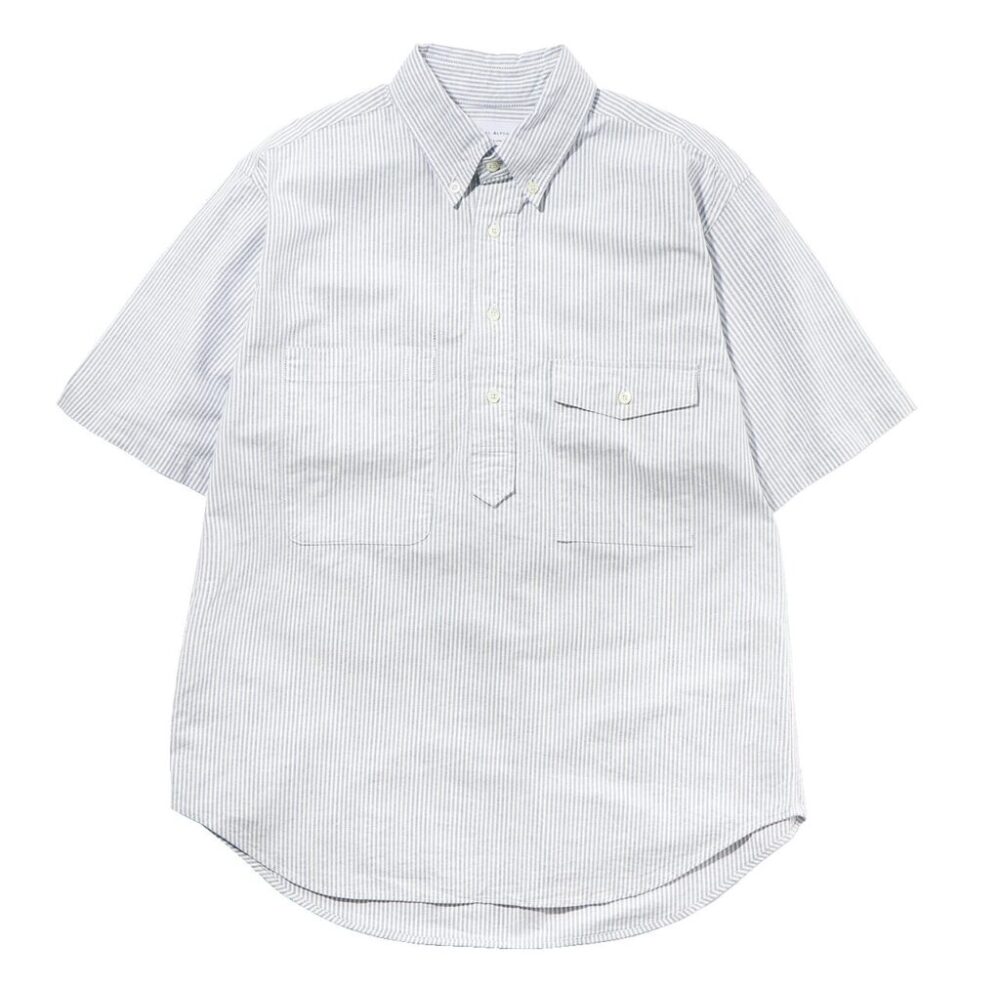 シャツを中心とした国産ブランド。よく見ると胸ポケットの仕様が異なるギミック。落ち着いたブルーグレーストライプ。1万6500円(エムケースクエアTEL06-6534-1177)