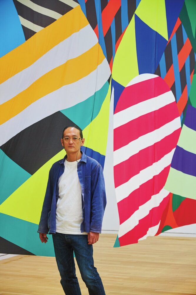 抽象画のように見えて実は具象、平面作品なのに奥行を感じてしまう不思議──ストライプや円形の組み合わせというシンプルな構成要素とビビッドな色使いで一度見たら強く記憶に残る作品を発表する美術作家、今井俊介さん。初の大規模個展の感想やブレのない制作の姿勢を伺った。