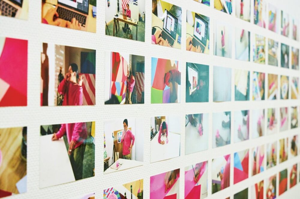 展示の最後には、PCでパターンを作って紙に出力したものを歪ませてカメラで撮影し、それをカンヴァスに描くという一連の制作過程を知ることができる、資料と制作に用いられる道具や画材も展示。こう見ると作品が完全に具象であるのがよくわかる。同エリアで観られるインタビュー映像にも制作風景が収録されている。