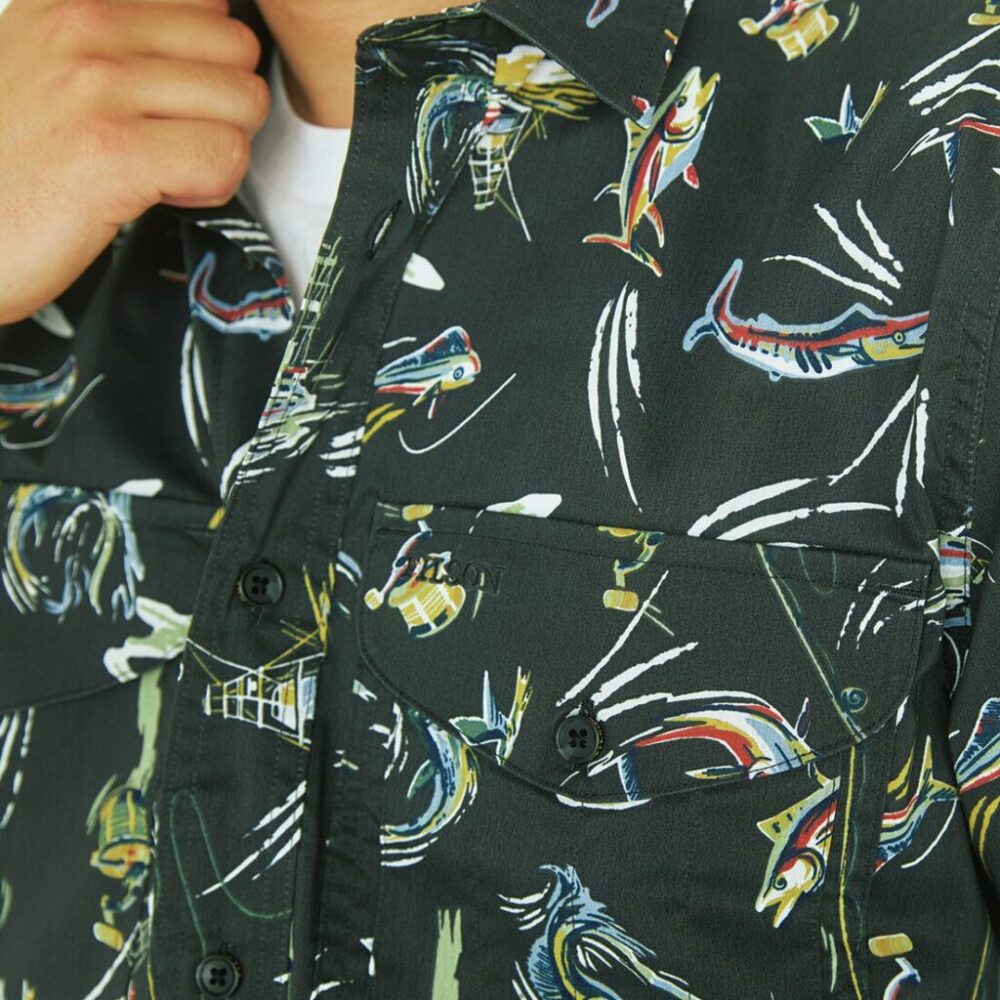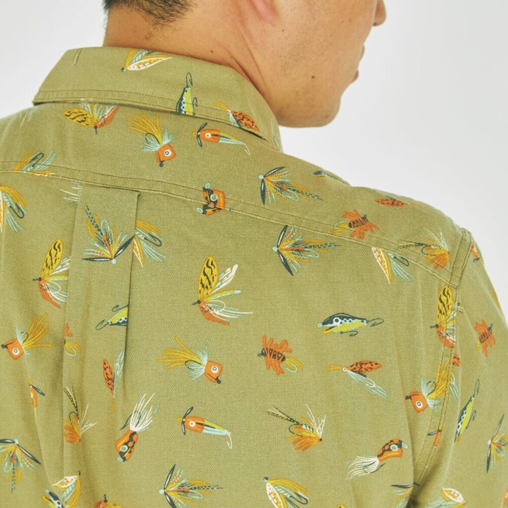 ヴィンテージ開襟シャツで稀にあるフライ(毛鉤)柄をベースに近代的なルアーの柄をミックスしたユーモアが素敵。微起毛の4オンスコットンで肌触りも気持ちいい。