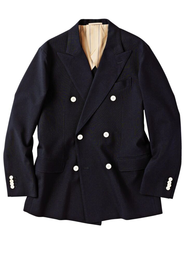 アイビー好きたるもの、夏でも紺ブレは手放せない。とはいえ、暑苦しいのはナンセンスでノーセンス。通気性と速乾性に優れたサマーウール製の1着で、涼しい顔して着飾りたいものだ。適度にドレッシーなラペルの付いたダブル仕様、ウエストの上品なシェイプ、ひとつずつ表情の異なる白ヤシのボタンなど、クラシカルなデザインも魅力のこちら。こだわりが詰まっているからこそ、さらっと纏うだけで調子いい。7万1500円(ヘムトPR TEL03-6721-0882)