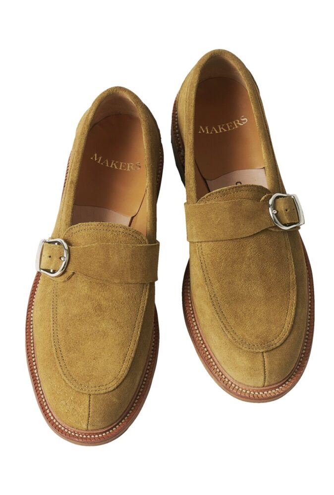 バックルベルトが付くローファーは、ともするとキザに映る。素足で履くか、ソックスを挟むか。その違いで生じる絶妙なフィット感の差に寄り添い、確かに実用的なんだけど。そんな靴好きのジレンマを、今作はうまく解消。ポテッとしたトゥがキュートなボリュームを演出し、あくまでカジュアルな顔に。上質な銀付きスウェード、日本人に合ったオリジナルラストなど、変わらぬ職人気質にも感銘を受ける。7万7000円(メイカーズTEL03-3872-8288)