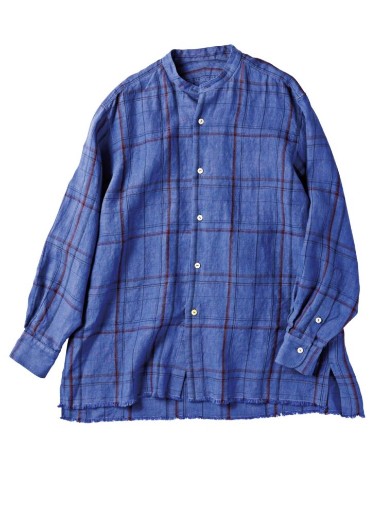 コシのある太番手のリネン糸を用いたオーバーサイズシャツに、大判のウインドーペーンで品の良さをプラス。かといってリラックス感がまったく損なわれていないのは、トップボタンがないバンドカラーのおかげか。意図的なムラが楽しいオーバーダイの為せる業か。はたまた、断ち切りの裾が独特のリズムを生むからか。多分、全部正解。いいシャツは、夏をいっそう楽しくする。あらためてそう思わせてくれる。4万9500円(ロフトマンB.D. TEL075-212-3988)