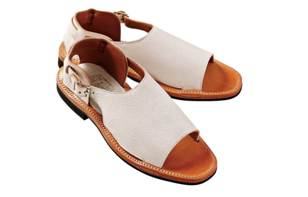 エンボスレザーで甲部分をすっぽり覆ったサンダルは、東京は世田谷に工房を構える靴のリペアショップ〈ブラス シュー co.〉のオリジナルブランドから。ソールからアッパーが剥がれることを防ぐ独自製法 「スリット ラピッド」を用い、メキシコの伝統靴「ワラチ」を現代的に解釈した。修理を専門とするショップが手掛けるだけに、ソールの張り替えなど繰り返しのリペアにもしっかり対応。気品ある革の変化とともに、着用者の成熟すら促す。5万600円(ブラスTEL03-6413-1290)