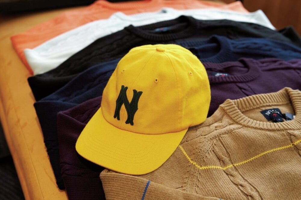 ウールボディにレターをあしらったキャップ。「N」は、NOAHの頭文字。蛍光トーンのグリーンだったり、こちらのイエローだったり、帽子で鮮やかなカラーをチョイ足し。