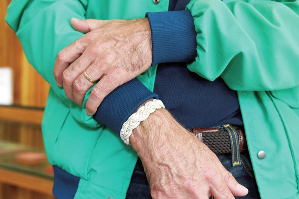 ロングアイランドに生まれ、サーフィンを愛好してきた彼は、潮の香りが漂うナンタケットノットワークスのロープブレスも好き。これも米国東海岸の伝統的アイテムのひとつ。