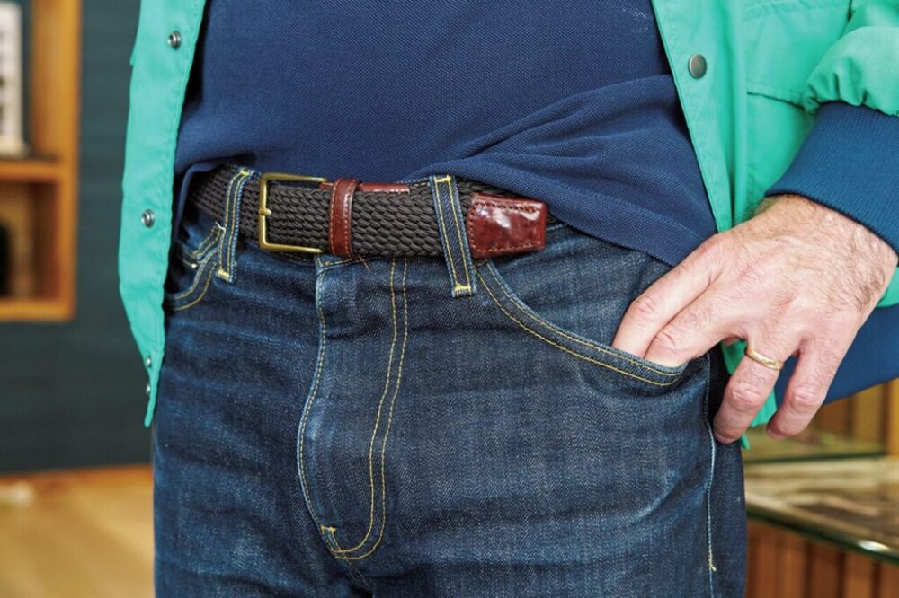レザーベルトでは堅い。リボンベルトでは柔らかい。ちょうどいいのが、適度に落ち着きも漂わせながら、決して堅くは見せないメッシュベルト。ポロシャツやデニムと好相性。