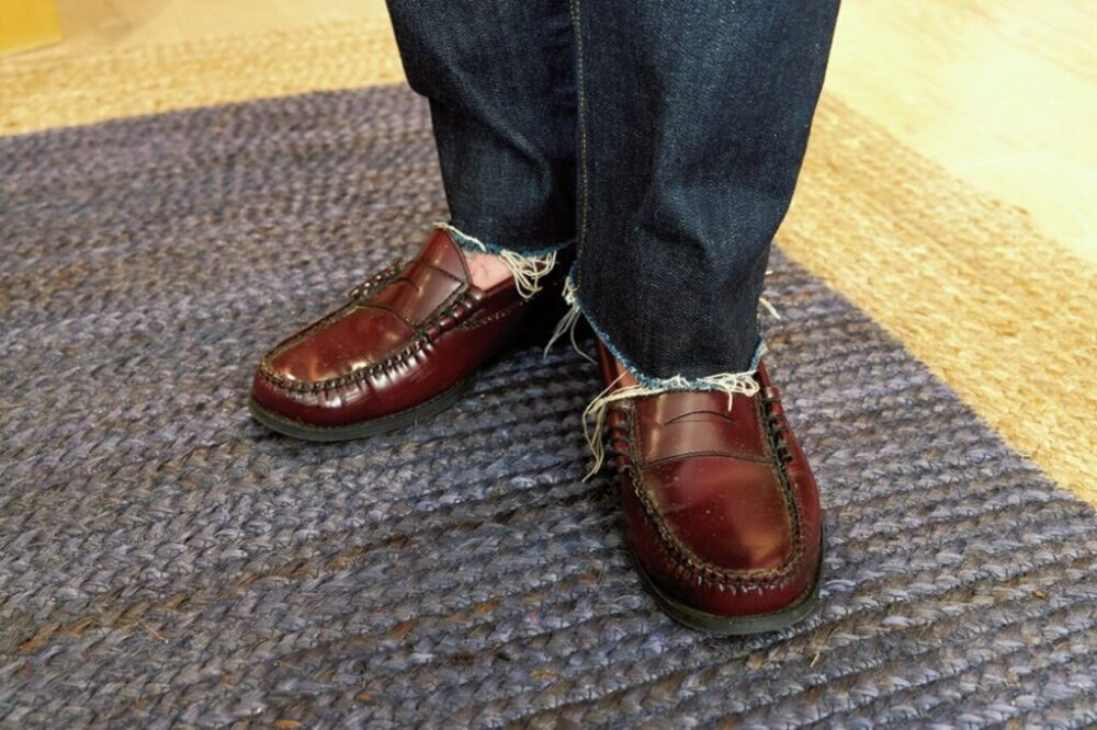 バーガンディーカラーのクラシックなローファーが好き(必ずしもコードバンでなくてOK)。デニムの裾は、カットオフの状態で合わせて気負わない装いを完成させている。