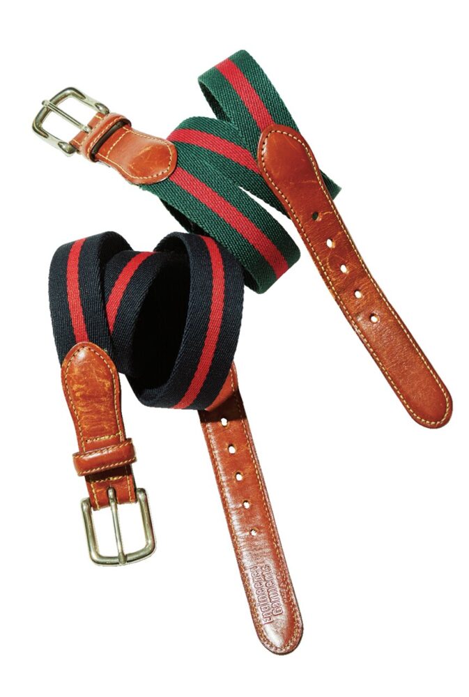 「ベルトはバックルを中心ではなくあえてサイドにもってきてフレッド・アステア風に小粋な感覚で着けます」。ベルトはアイビー御用達のアメリカブランドでまとめて購入。