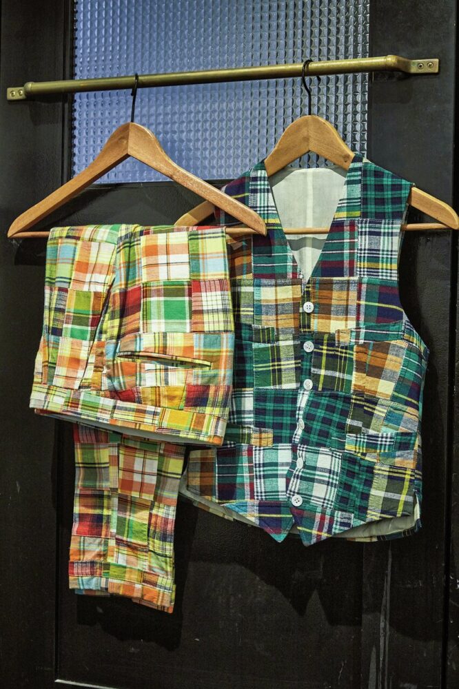 パンツとベストはオーダー品。「プレッピーには欠かせないクレイジーマドラスチェックが復権。マドラスはシワ感が大事なので、新品は1度スプレーシャワーをしシワ感を出すことがコツ」