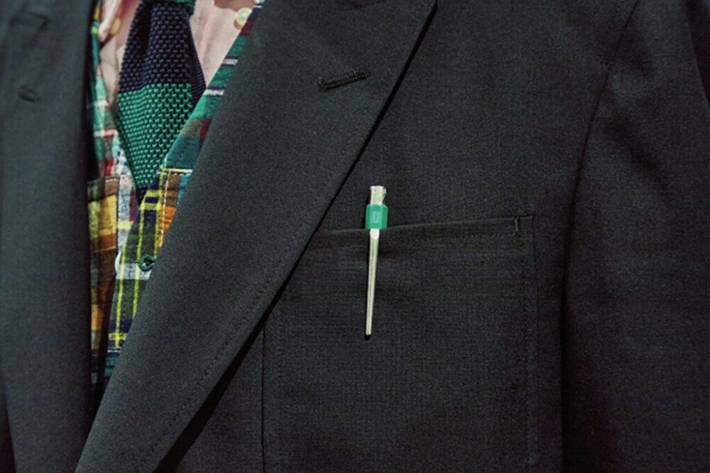 「ジャケットの胸ポケットにチーフを挿すのは紳士のマナーですが、それはあくまでイタリア流。アイビーを信条とする私はカランダッシュのボールペンをポケットに挿して粋に」
