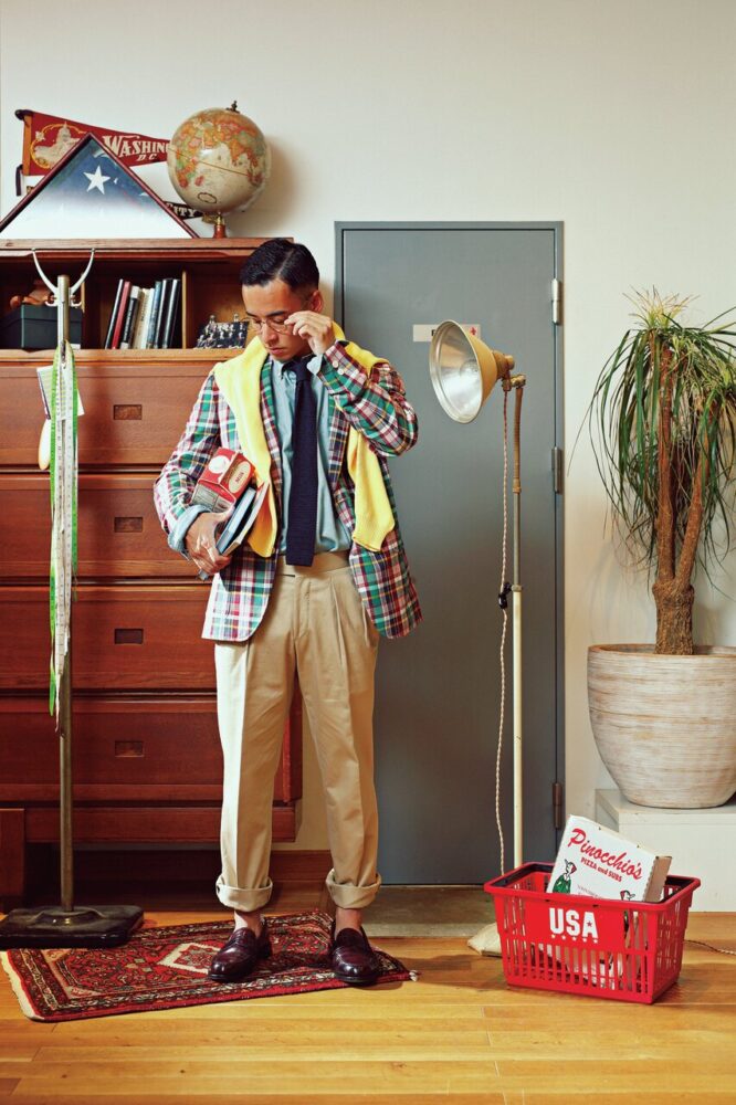 ただ、純粋なアイビールックより色味は派手で明るく、育ちの良いお坊ちゃま学生を想起させます。ピンクやイエロー、ライトグリーンの色使いはラルフ ローレンからの影響も多分にあります。サイズ感も大きすぎず小さすぎず、きちんとジャストサイズを選んでいる印象です。