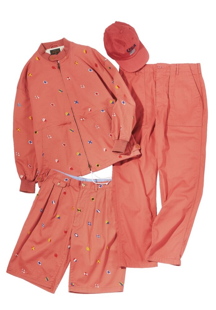はるばる現地まで足を運ばずとも、日本で手に入るナンタケットレッドを紹介する。【左】1960年代のコットンブルゾンを現代的にアップデート。タック入りのボリューミーなパンツとのセットで。カラフルなエンブレムはインクジェットマッピングを採用し複雑な配色を再現した。ジャケット6万3800円、ショーツ3万3000円(ともにビームス プラス 原宿TEL03-3746-5851) 【中】アメリカ製にこだわり、自社生産を貫くアメリカコロラド州のキャップメーカー。7480円(メイデン・カンパニーTEL03-5410-9777) 【右】定番の[ファティーグパンツ]を鮮やかなナンタケットレッドに。3万1900円(エンジニアド ガーメンツTEL03-6419-1798)