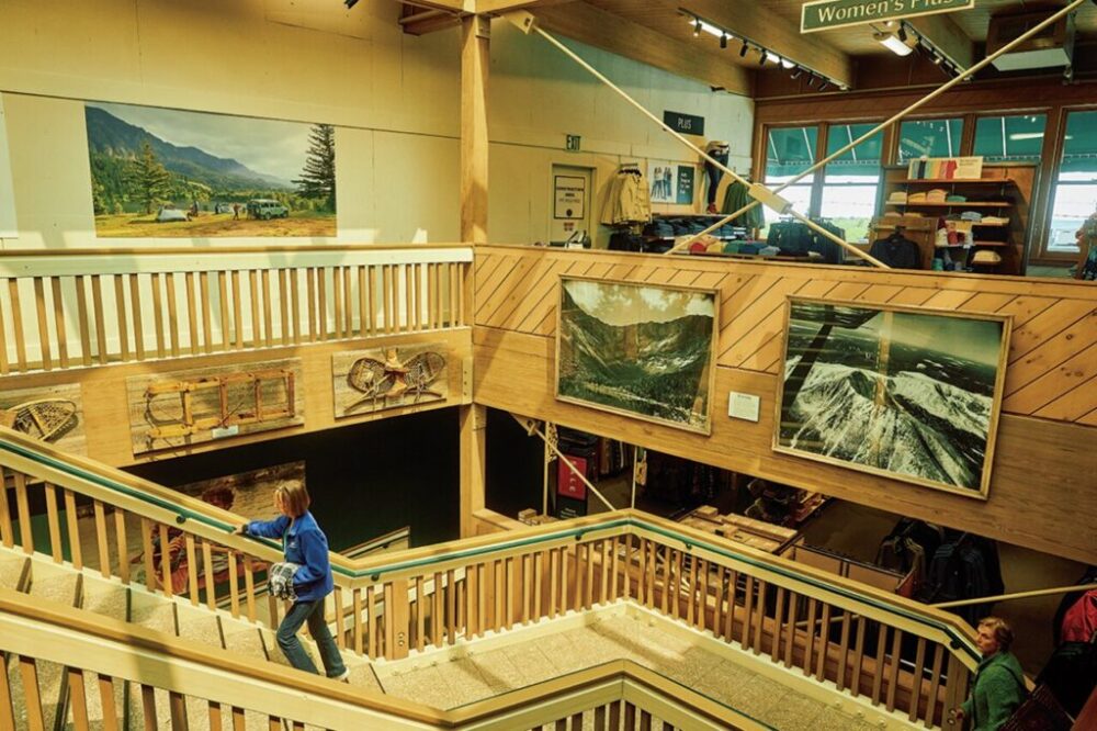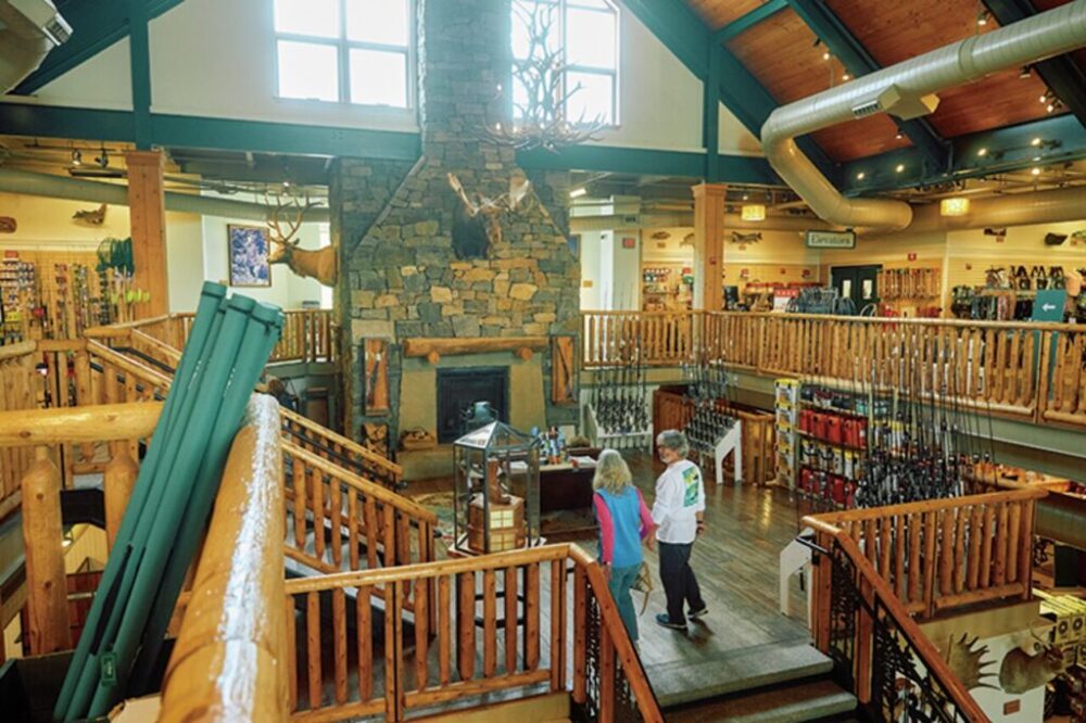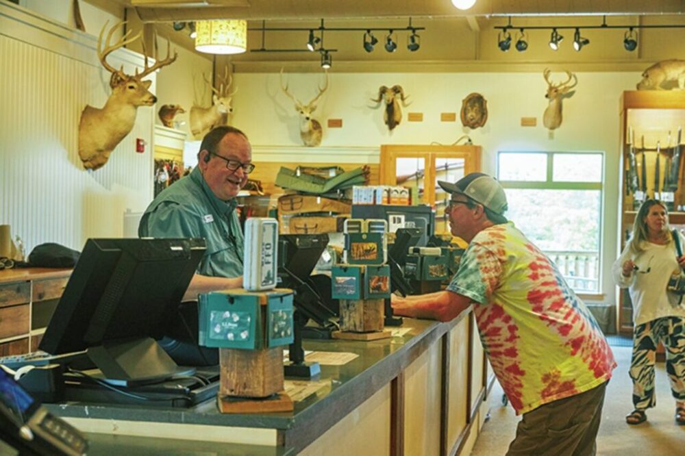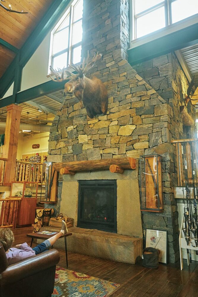 ずらりと猟銃や剥製などが並ぶ光景は旗艦店ならでは。自らも釣りや狩りなどアクティビティを楽しむ従業員たちとカスタマーとの間で繰り広げられるアウトドア話は尽きない。