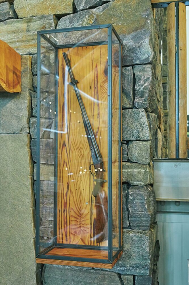 昔ながらの狩猟部屋をイメージした寛ぎスペースも。暖炉脇に飾られた猟銃は創業者本人が使用していたもの。右目が不自由だった彼のために左目で照準できるようにカスタムされていた。