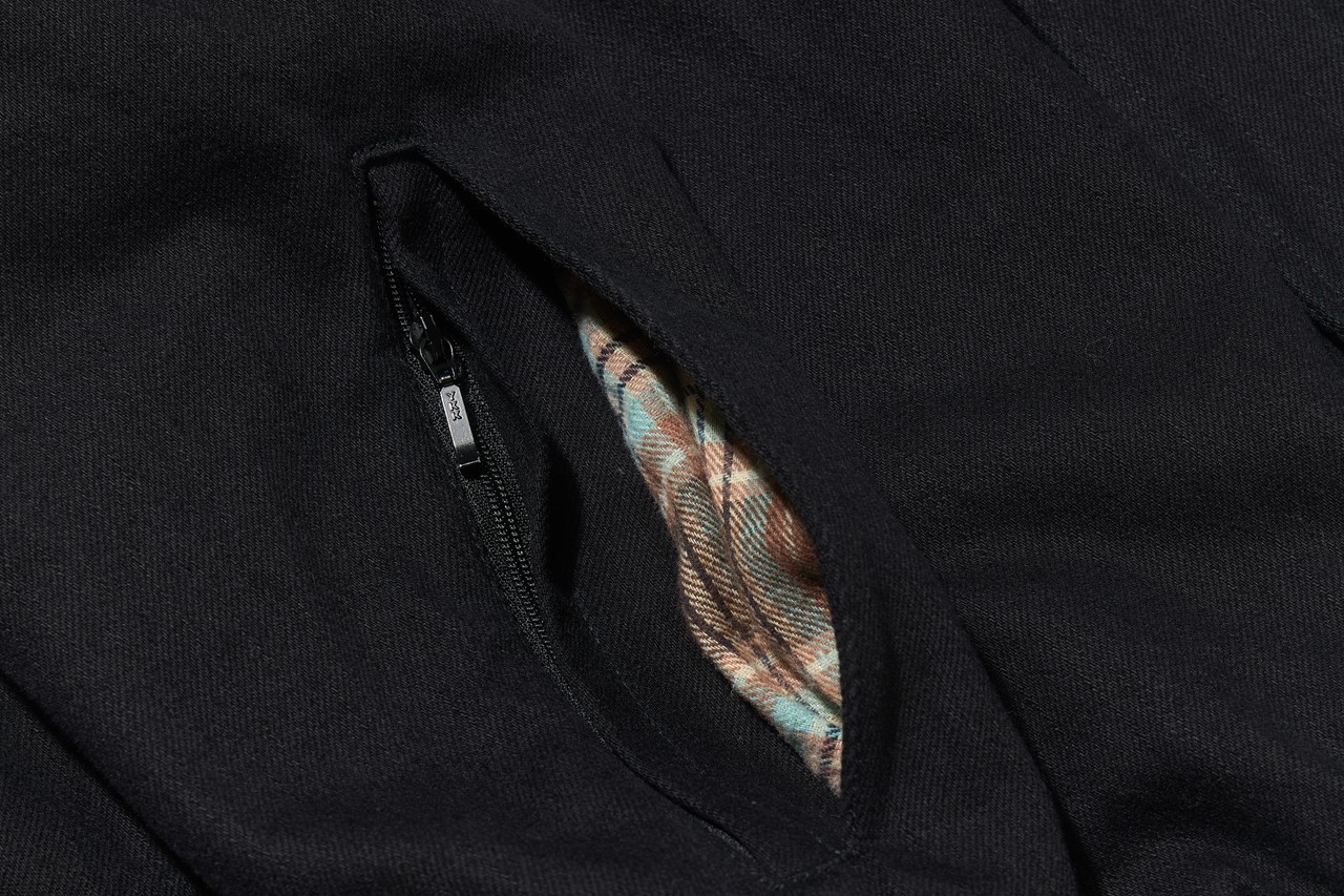 古着のポリ混のチープな雰囲気ももちろん捨てがたいが、トラッド派には少々取り入れづらい素材感だった。さらに秋冬のアウターとしての使い勝手も視野に入れ、縦糸も横糸も黒糸を使った濃黒のデニムというアイデアに到達。古着のダービジャケットと比べると圧倒的な高級感&シックな佇まい。トラッド派の貴方もきっと満足する白眉の出来だ。