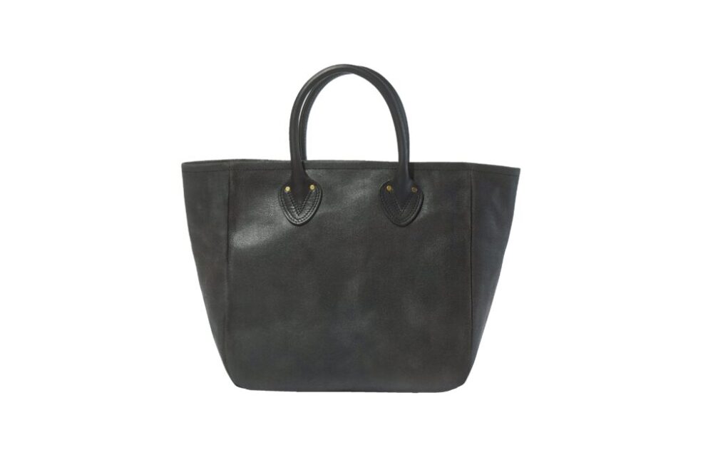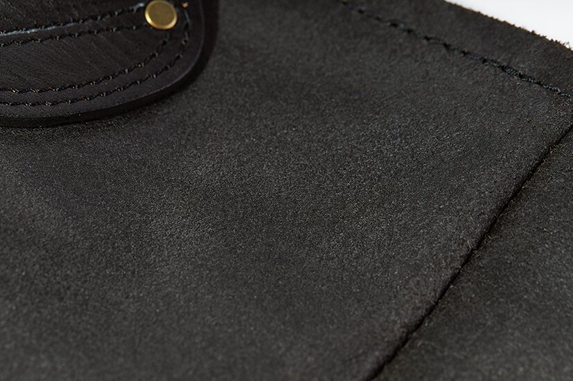 ブラックのレザーバッグというと艶っぽくてキザになりすぎたり、はたまた男らしく武骨になりすぎたりと、存在感が強いがあまり躊躇する人も多いものだが、「スムースレザーではなく、スウェードやラフアウトで作ったらどうなる?」という発想から生まれた上品なレザートートバッグ。重くなりがちな革のバッグだけに手にも優しい軽さにしたいという発想を元に、メーカーに駆け込んだところ、「ニベ」なる聞きなれないレザー素材を提案された。