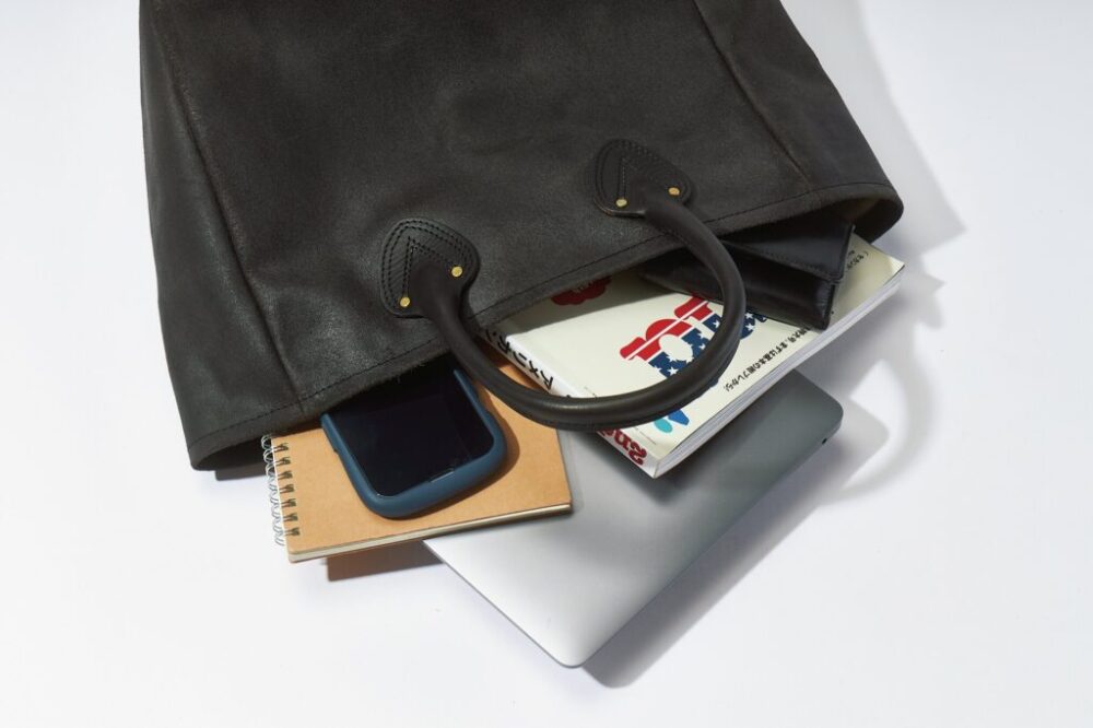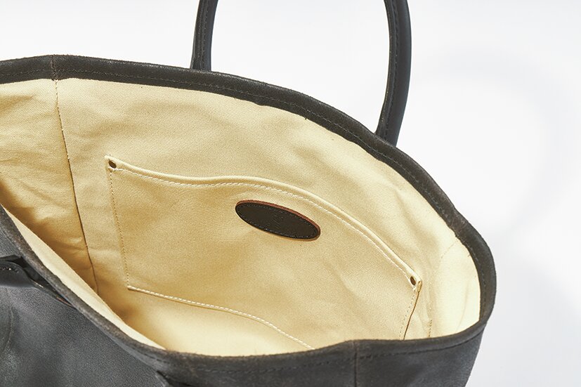 ただし、その分、加工は通常のレザー以上に多くの工程を踏んでいて、手染めで染色し、一般的なレザー以上にオイルを多めに含ませた上にオイルを刷り込んで磨きをかけ、焦がし加工なども行うことで、唯一無二の表情を生み出している。前述の素材選びのおかげで軽量な仕上がりとなっているが、厚手のキャンバスライナーのおかげもあって耐久性などは全く問題ない。レザートートというだけで、重さを気にする女性が持っても気にならない700g程度。
