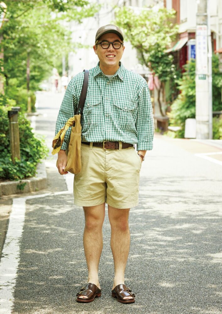 この日のパンツはベルナールザンスにブラック×オリーブのシアサッカー素材でオーダーしたスラックス。「インターナショナルギャラリービームスの靴下でオリーブを、ビルケンシュトックのボストンでブラックを拾っています」