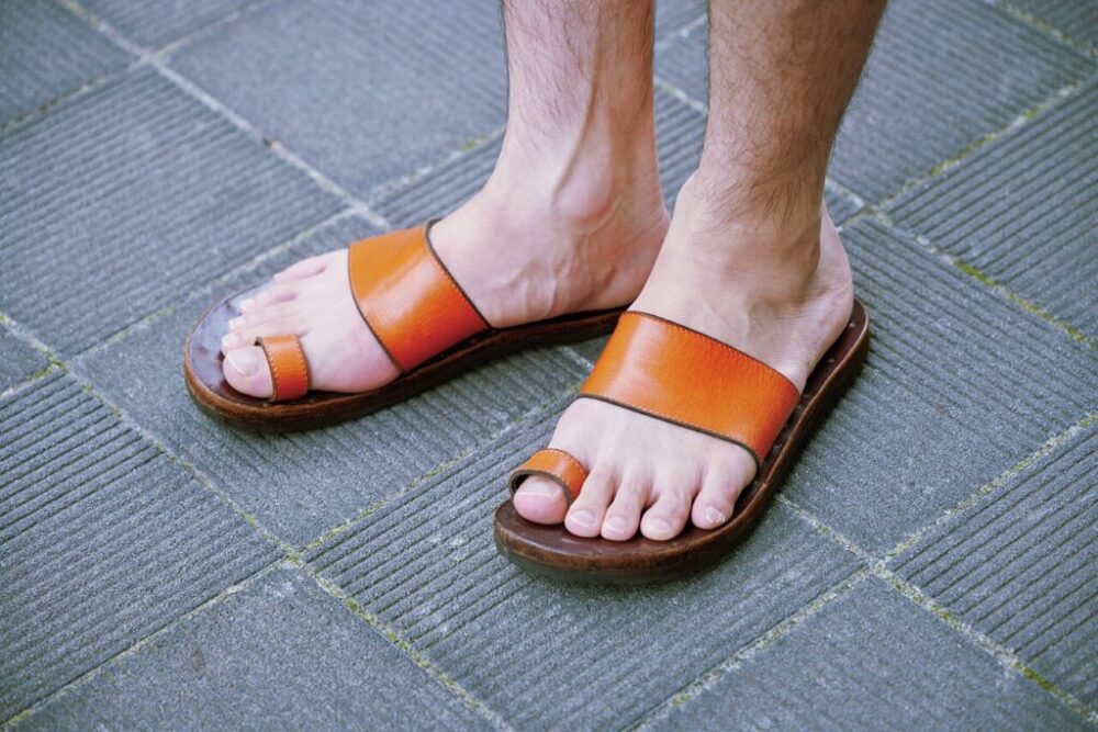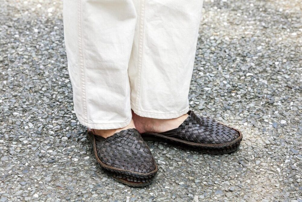 インドの伝統的なサンダルから着想を得た手編みのサンダルで、ヌメ革を変色させた独特な風合い。「インド人にとってこのシューズはアメリカ人にとってのモカシンシューズのようなもの。足元に軽さを出したい時に最適です」