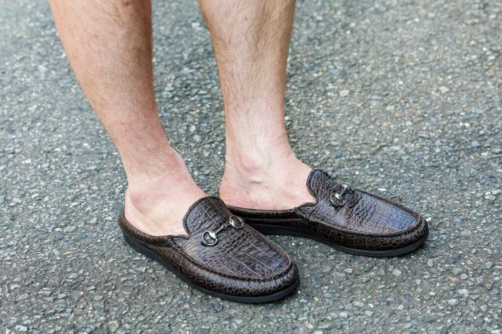 クロコの型押しによってややエレガントな印象に。「足が見える面積がちょうど良くて、涼しげかつカチッとした雰囲気が好みです。パンツがグレーで少し重たいのでヌケ感を出すために裸足で着用しています」