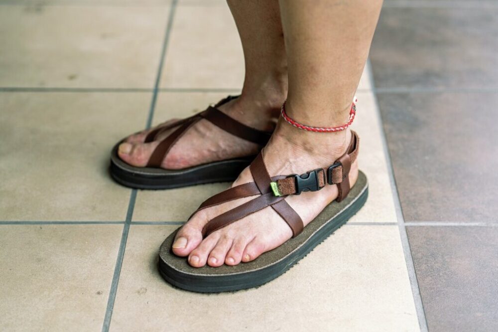 ストラップの形状が特徴的なアメリカ製のハンドメイドサンダル。「元はブーツを作っていたブランドのウォークオンウォーターというモデルです。アウトドアサンダルと同じソールが使われており、柔らかい履き心地が気に入っています」