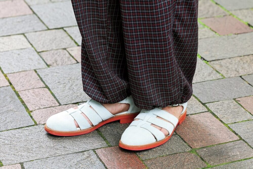 ホワイトバックスにブリックソールが軽やかな印象のグルカサンダル。「ジャケットには普通の革靴を合わせるのが一般的ですが、トラッドなマインドが感じられるこのサンダルはジャケットとも好相性」