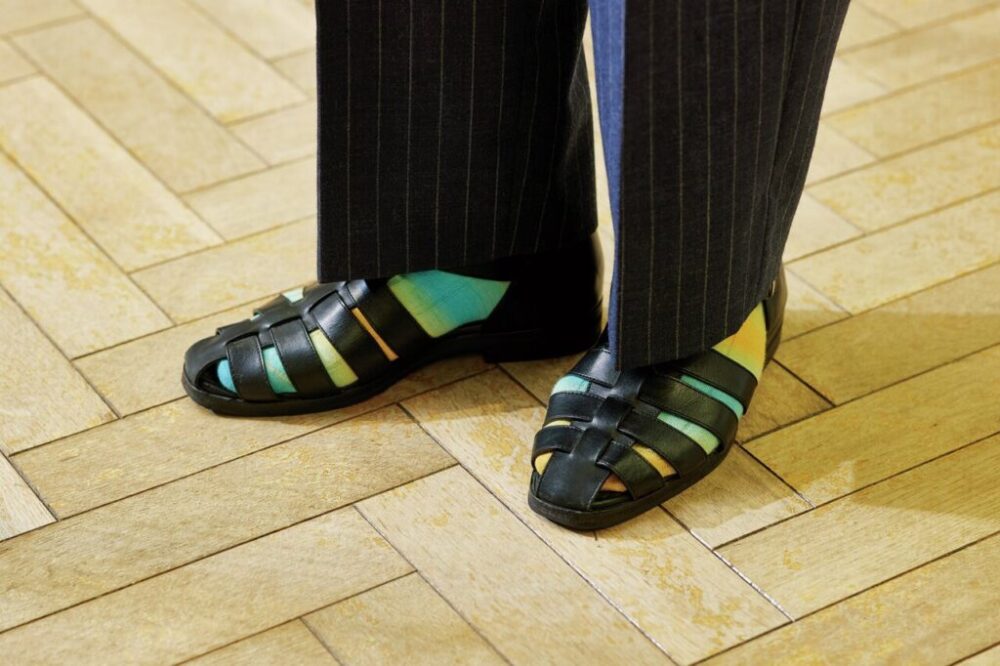 ドレッシーな細めのラストが特徴の人気モデル・フェレットにタイダイ柄のソックスをイン。「グルカサンダルとカラーソックスの合わせはよくやります。今回はタイダイのリゾートっぽい要素を加えました」