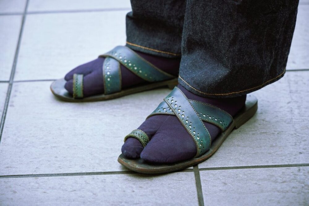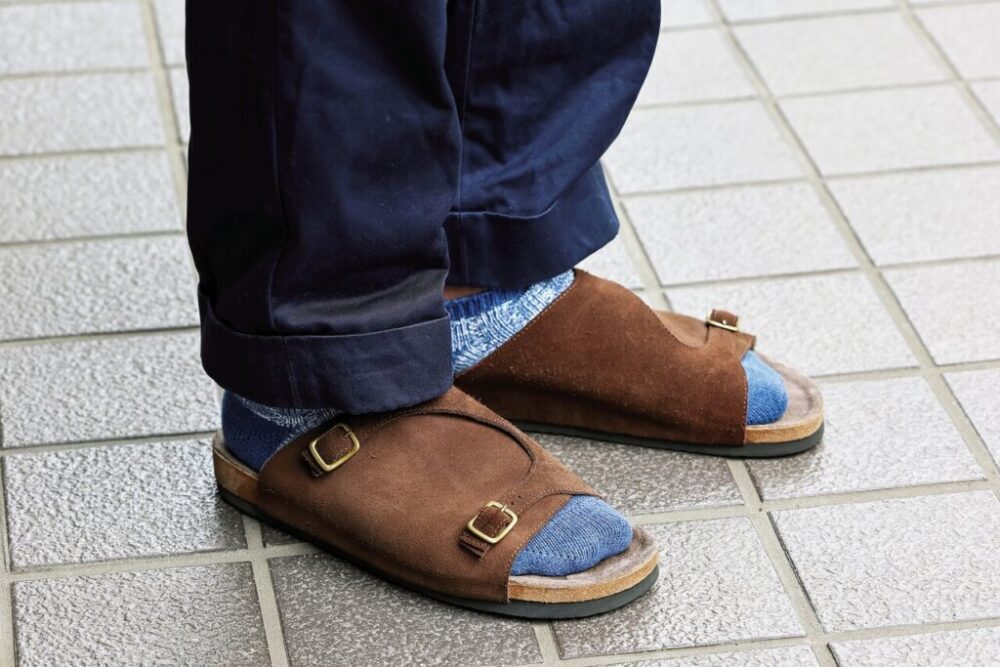 オーダーで作ったインディゴブルーのレザーサンダルにはメダリオンの装飾入り。ソックスには藍染の足袋を選んだ。「最近、江戸の文化に興味があって、この足袋は歌舞伎役者からも注文を受けている歴史ある足袋屋さんのものです」