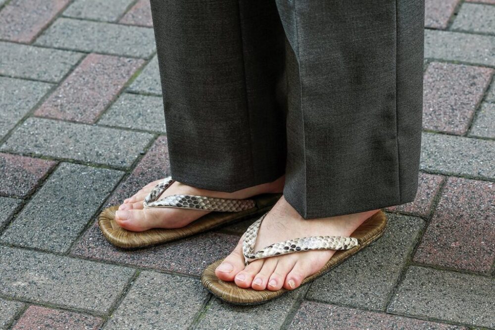 レザーソール、ヘビ革の鼻緒はドラマ『男はつらいよ』の寅さんが着用している雪駄と同じディテール。「背広に雪駄を合わせたいという気分が去年から続いていて。いい物を履けば洋服とも合わせられます」