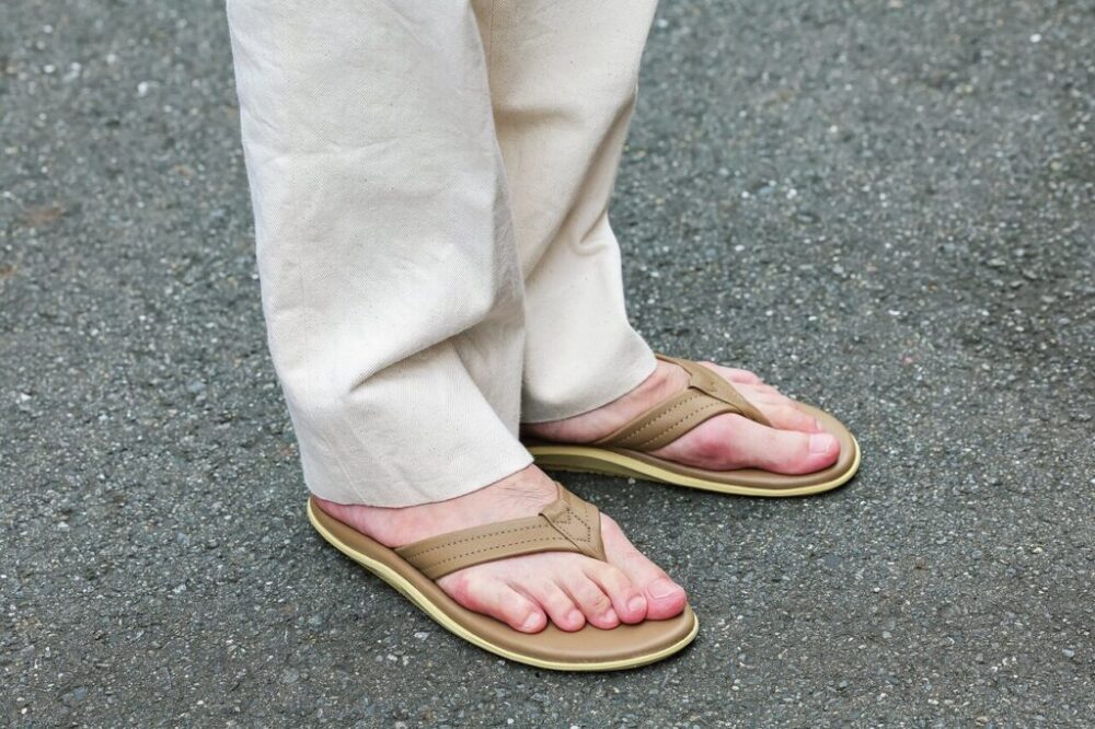 ハワイ生まれのアイランドスリッパを代表するトングサンダル[PT202]。「こちらは今年の新色であるトーブをまとっています。ホワイトデニムと合わせれば、夏らしい爽やかさに加えて上品さも漂わせてくれます」
