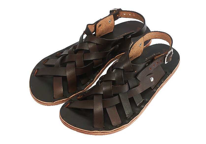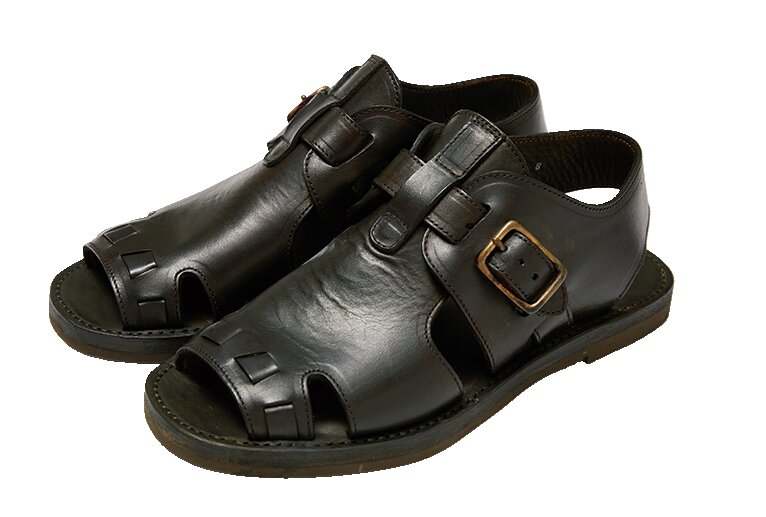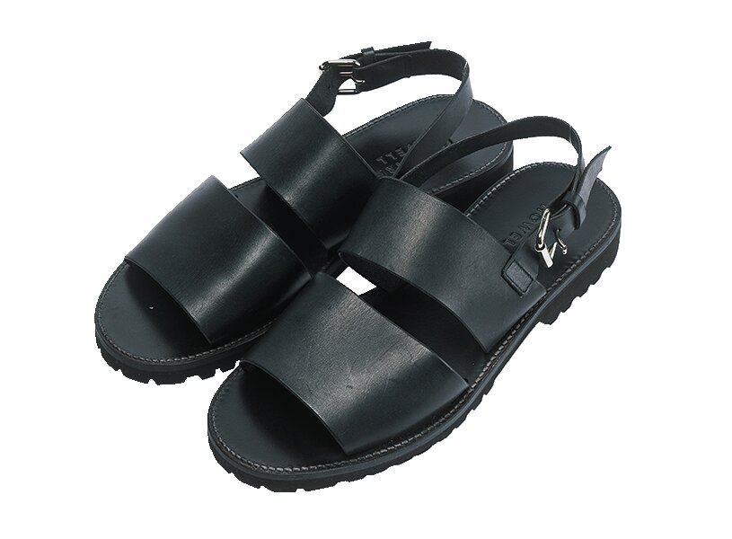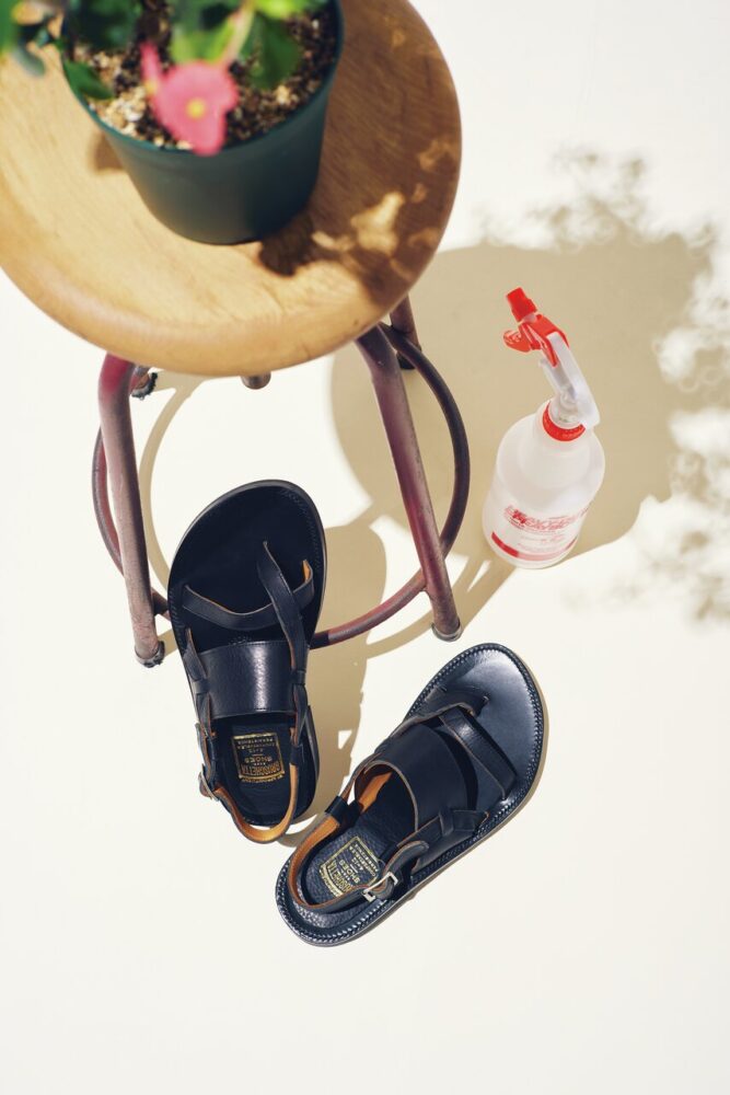ヴィンテージのアメリカンサンダルを参考にした一足。親指のループは踏み込んだ際に緩みが出るよう作られ、オブリークトゥと併せてコンフォートなモデル。ヒールのストラップをずらせばバックルを外さずとも着脱できる。5万600円(ブラスTEL03-6413- 1290)