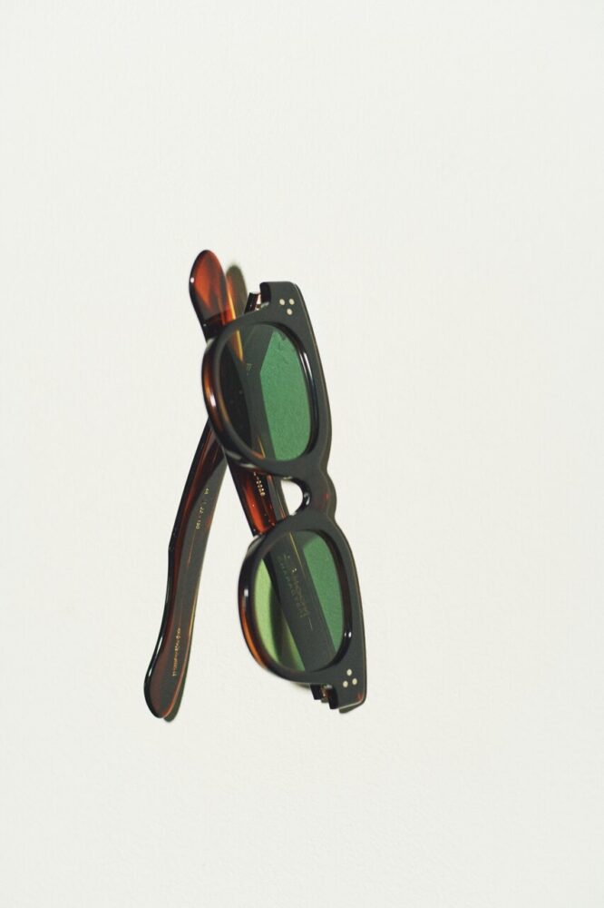 リム両端が突起したフレームに施された重厚な3ピンのカシメパーツがより力強くサングラスにも最適。レンズは濃いめのグリーンがアメリカンヴィンテージのお約束。サングラス4万5100円(プライベートアイズアンドトラッカーズTEL070-1577-2666)