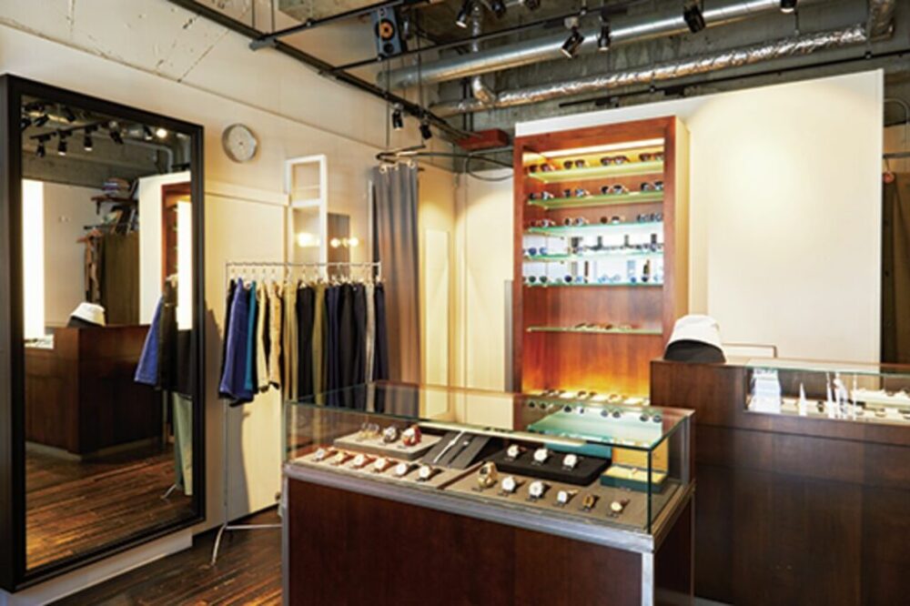 感度の高いメガネ&サングラスのセレクト店として、クリエイターやファッション業界人も御用達の恵比寿の名店。そのとなりに構えるエクストラスペースは、コンティニュエのメガネスタイルにあった時計や服などを提案する。