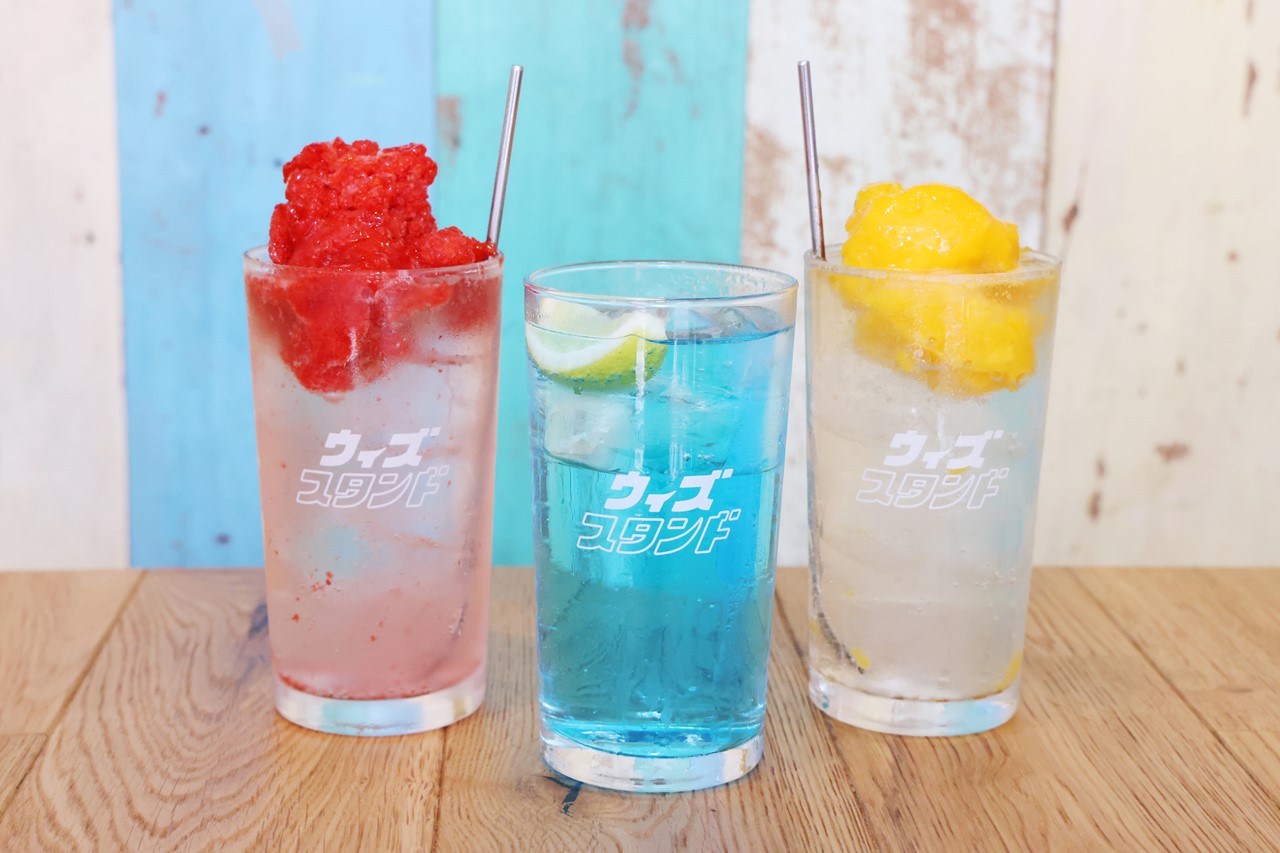 ウィズスタンド限定ドリンク。左からあらごし苺サワー、青いレモンサワー、あらごしマンゴーサワー。