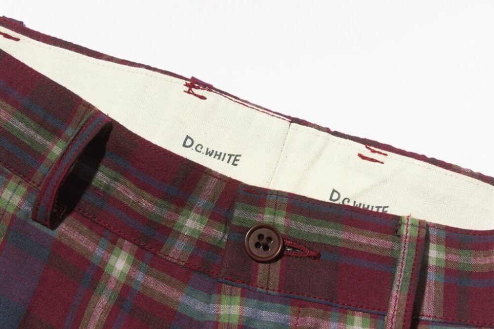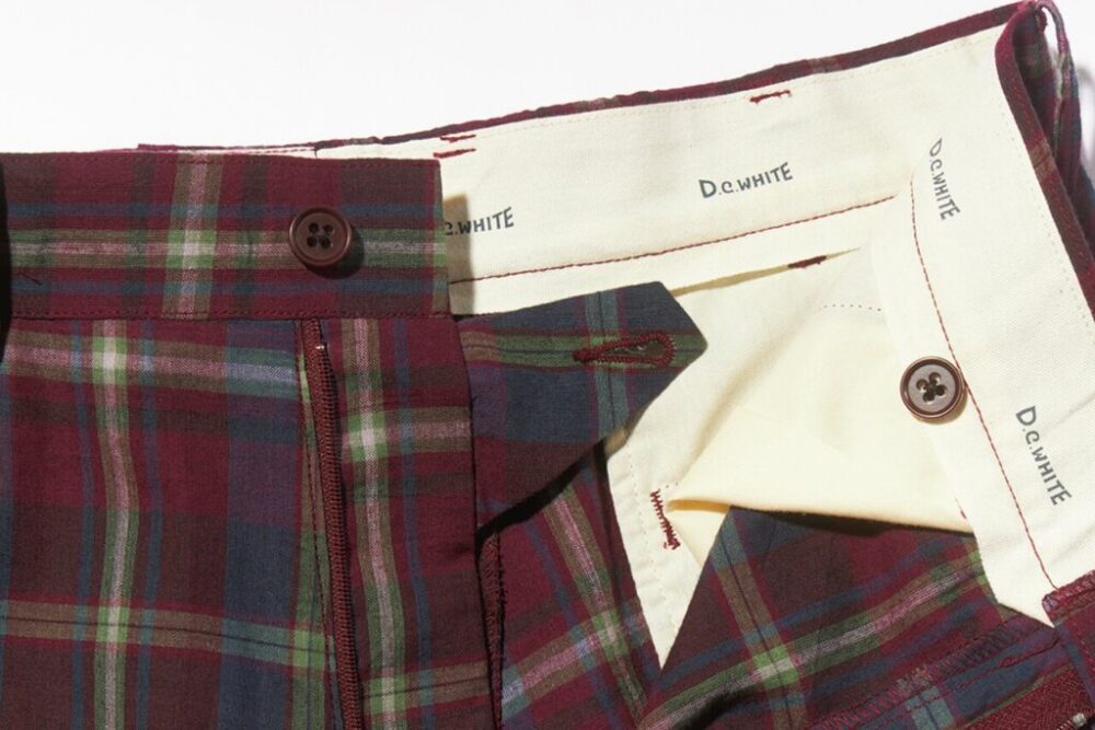 そこで編集部が所有していたヴィンテージトラウザースをもとに、幾種類もの生地サンプルの中からダークマドラスをチョイス。トラッドマンから絶大な支持を集める〈D・C・White〉ならではの、仕立てのいいトラウザースが完成した。